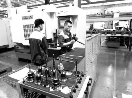在天津長榮印刷設備股份有限公司新竣工廠房的組件車間內(nèi),工作人員在運用各種型號的工具將各式零部件安裝在機器上。本報記者 王勤 攝